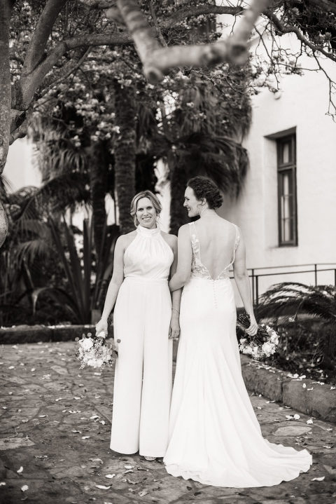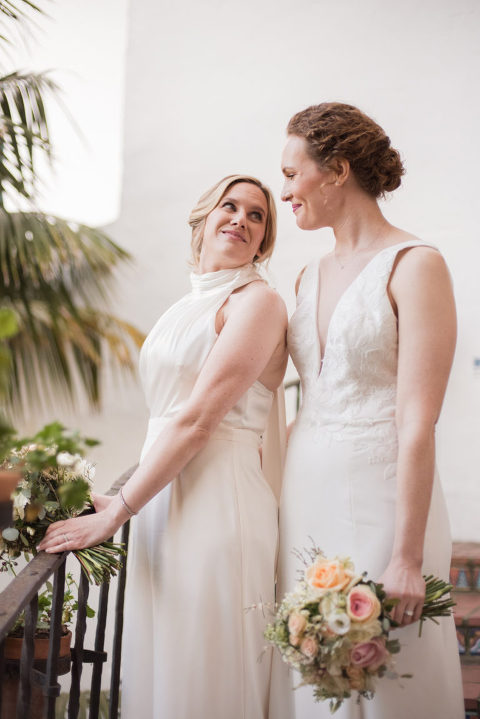 two brides laughing together at their Santa Barbara courthouse wedding