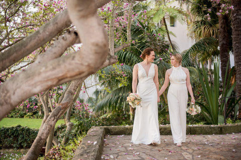 These beautiful brides wanted a low-key wedding with just a few guests in attendance. Devon was stunning in a sleek white pantsuit while Rachel wore a traditional white wedding gown. When they first saw photographs of the Mural Room they knew that was the perfect location for their wedding. They loved the gorgeous murals and the warm light that streams in late in the afternoon.